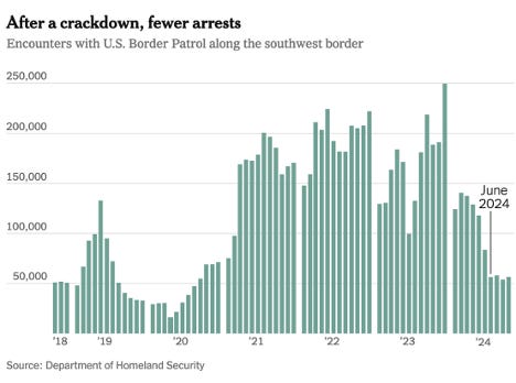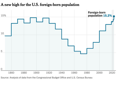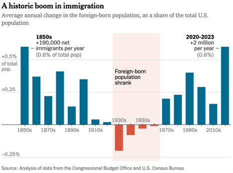 The immigration surge of the past few years has been the largest in U.S. history, surpassing the great immigration boom of the late 1800s and early 1900s, according to a New York Times analysis of government data. Annual net migration — the number of people coming to the country minus the number leaving — averaged 2.4 million people from 2021 to 2023, according to the Congressional Budget Office. Total net migration during the Biden administration is likely to exceed eight million people. That’s a faster pace of arrivals than during any other period on record, including the peak years of Ellis Island traffic, when millions of Europeans came to the United States. Even after taking into account today’s larger U.S. population, the recent surge is the most rapid since at least 1850: