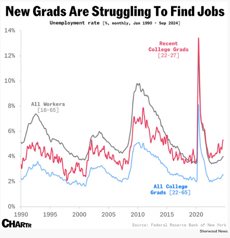 market, but if you’re a recent college grad with a shiny new diploma, your reality might not be matching up with the overall mood. According to the latest data from the New York Fed, the unemployment rate for recent grads (ages 22–27 with a bachelor’s or higher) climbed to 5.3% in September — the highest in over two years and up 90 basis points from last year. That’s more than double the 2.5% rate for all college graduates (ages 22–65), and it’s also significantly worse than the rate for the wider workforce, breaking a multi-decade period in which recent college grads generally had lower levels of unemployment.