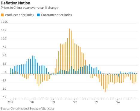 Chinese leaders this week pledged to do more to stimulate the economy, including by cutting interest rates and boosting government borrowing. But pressure is building on Beijing to take even more forceful action to prevent a downward spiral of deflation that becomes self-reinforcing, potentially landing China in a longer-term recession. Prices for goods leaving Chinese factories have fallen year-over-year for 26 consecutive months, dropping 2.5% in November from a year earlier, and there is little sign of them turning up again soon. China’s gross domestic product deflator, a broader gauge of price levels across the economy, has been in negative territory for six consecutive quarters, the longest stretch since the late 1990s.