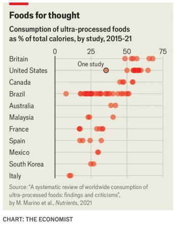 With the invention of tinned goods and pasteurisation in the 19th century, food alchemy became possible on an industrial scale. Processing innovations made food cheaper, more convenient and plentiful. According to the UN, the average daily food supply available for a person in the rich world increased by over 20% between 1961 and 2021, to 3,500 kilocalories. In that time, obesity rates have more than tripled; today, nearly one in three people globally is obese or overweight. Now concerns are growing that the heavy processing used to cook up cheap, tasty nibbles may itself be harmful. A particular target is “ultra-processed foods” (upfs), a relatively recent label put forward by Carlos Monteiro, a Brazilian scientist. Robert F. Kennedy junior, Donald Trump’s nominee for secretary of health, has likened processed food to “poison” and promised to reduce the share of UPFs in American diets. In November 2023 Colombia imposed a tax on highly processed foods and drinks. Authorities in Brazil, Canada and Peru have advised the public to limit consumption of these foods. In Britain parliamentarians are investigating the effects of UPFs on people’s health. At the heart of the debate is a question: are upfs unhealthy because their nutritional content is poor, or does the processing somehow pose risks in itself? New research may soon provide answers that could reformulate what people eat. People on the ultra-processed diet ate about 500 more calories per day than those on the unprocessed one. They also ate faster and gained an average of 1kg (2.2 pounds) over two weeks. On the other diet, participants lost a similar amount of weight. Dr Hall says that, though the study was short and conducted in an artificial setting, the results suggest that excess amounts of salt, sugar and fats might not be fully to blame for the ill effects of processed food.