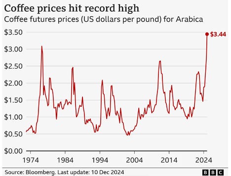 Coffee drinkers may soon see their morning treat get more expensive, as the price of coffee on international commodity markets has hit its highest level on record. On Tuesday, the price for Arabica beans, which account for most global production, topped $3.44 a pound (0.45kg), having jumped more than 80% this year. The cost of Robusta beans, meanwhile, hit a fresh high in September. It comes as coffee traders expect crops to shrink after the world's two largest producers, Brazil and Vietnam, were hit by bad weather and the drink's popularity continues to grow.