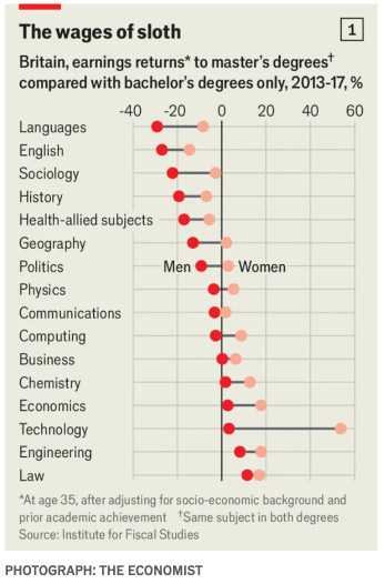 On both sides of the Atlantic, choice of subject is the single biggest factor determining whether a master’s boosts earnings. In America returns are especially large in computer science and in engineering. They are slightly smaller in other science subjects, in part because an undergraduate degree in these already bumps up salaries by quite a lot. Teachers who bag graduate degrees in education tend to earn more, even if wages for the profession as a whole are fairly low, because many American school districts automatically raise the pay of those who have them. More striking are the large negative returns in some subjects. British men who complete master’s degrees in politics earn 10% less in their mid-30s than peers who do the same subject at undergraduate level only. For history the hit to earnings is around 20%; for English it is close to 30% (see chart 1). Many of the people on these courses are targeting careers that they know will be low-earning, but which they think they will enjoy, explains Dr Britton. But some drift into advanced study because they have not yet decided what profession to pursue. It should probably not be a surprise that these people tend to earn less in the medium term than peers who have rocketed straight from bachelor’s courses into jobs.