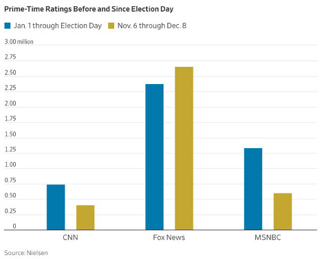 Cable news loyalists have grown a lot less loyal—to MSNBC and CNN, at least. While viewers are flocking to Fox News in the wake of Donald Trump’s election win last month, ratings for MSNBC and CNN have tumbled. The declines are far worse than what happened the last time Trump won, in 2016. MSNBC averaged 603,000 prime-time viewers from the day after the election through Dec. 8, down by more than half from the network’s year-to-date average through the election, according to Nielsen data. CNN was down 46%, to 401,000 viewers. Meanwhile, Fox News was up 12%, averaging about 2.7 million viewers. MSNBC and CNN both reported dips for the month following the 2016 election, but they weren’t nearly as steep. CNN’s drop was off a higher baseline.