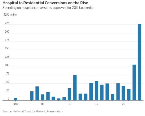 Across the country, closed hospitals and their land are becoming a prime target for towns looking to boost limited housing stock. Hospitals offer features that make them readily adaptable to homes, such as tall ceilings, broad hallways and abundant natural light. That is a notable advantage over hulking office towers with large floors that often face financial or logistical challenges to residential conversion efforts. Hospitals are also typically located on prime real estate near city infrastructure, ideal locations for residences. The U.S. government is incentivizing the process, too. Federal historic tax credits to these conversions are skyrocketing while demand for housing stays high. In 2023 alone, spending on these projects eligible for a 20% federal historic tax credit totaled more than $225 million, according to a Wall Street Journal analysis of data compiled by the National Trust for Historic Preservation.