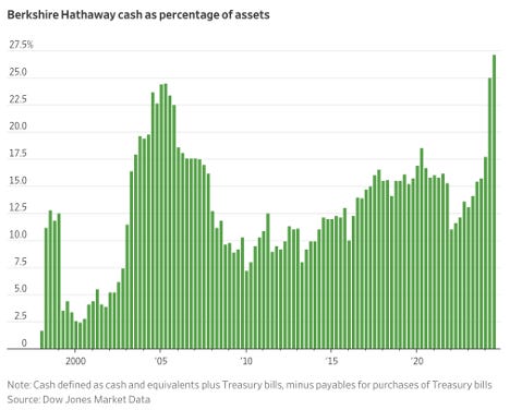 Warren Buffett is known for picking stocks. These days, he is increasingly picking cash. The mountain of cash and Treasury bills at the famed investor’s company, Berkshire Hathaway, rose above $300 billion in the third quarter—easily a record and its highest as a percentage of company assets in data going back to 1998, according to Dow Jones Market Data. Holding lots of cash is standard practice for Berkshire, but the scale of the recent buildup has raised eyebrows among some observers of the Omaha, Neb., conglomerate.