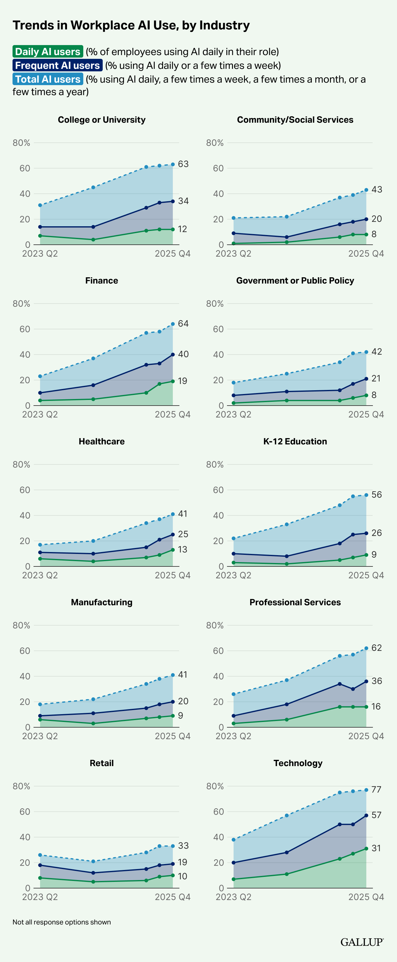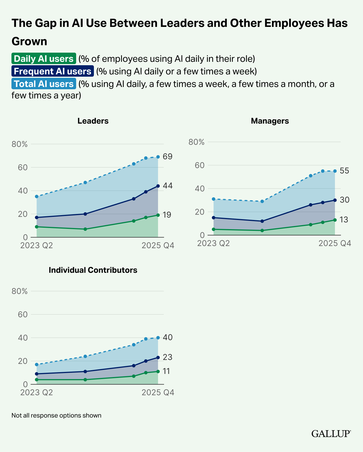 Adoption remains highly uneven. Knowledge-based industries lead by a wide margin, with technology, finance, higher education, and professional services showing the highest use, while retail, manufacturing, healthcare, government, and social services lag far behind. Roles that are remote-capable account for most of the growth, with two-thirds of those workers now using AI, compared with about one-third in non-remote-capable jobs. Leaders also use AI far more than managers or individual contributors, and the gap is widening. According to Gallup, this pattern helps explain why overall adoption appears to be slowing: AI is becoming more embedded among certain industries, roles, and leaders, even as many workers see little relevance or clear use for it in their jobs.
