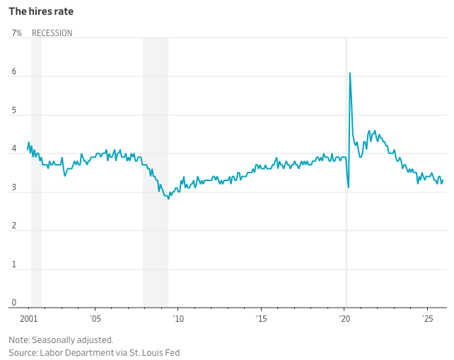 U.S. hiring has slowed sharply due to a mix of factors, including tariff uncertainty, high interest rates, post-pandemic overstaffing in tech, and a drop in worker mobility. With fewer employees quitting—3.2 million in December compared with 4.5 million at the 2022 peak—employers have less need for replacement hiring. The hires rate has fallen to 3.3%, well below pre-pandemic levels, even as unemployment remains relatively low at 4.4%.