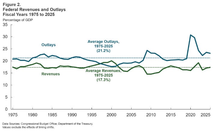 Despite aggressive rhetoric about cutting government, legislative actions have not meaningfully reduced spending. Trump’s major tax-and-spending package is projected to add trillions to future deficits, and continuing resolutions have largely preserved prior spending levels. Efforts such as workforce reductions and rescissions have produced limited savings, while entitlement programs and rising interest payments remain the primary drivers of long-term deficits. Without structural reforms to Social Security, Medicare, and Medicaid, deficit growth is expected to continue regardless of executive actions.