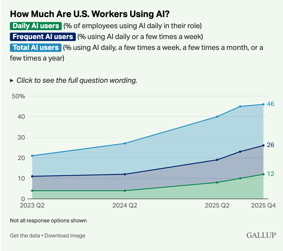 Workplace AI use in the U.S. continued its gradual climb in late 2025, driven more by deeper use among existing users than by new adopters. Daily AI use rose from 10% to 12% in Q4, and frequent use (a few times a week or more) increased to 26%. However, overall adoption stalled: nearly half of U.S. workers still say they never use AI at work, and the share of total users (those using AI at least a few times a year) was flat after earlier rapid gains.