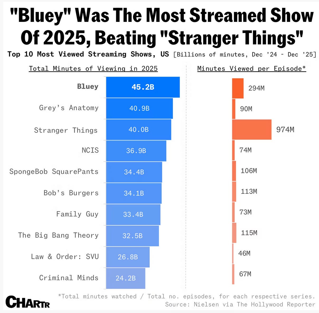 Bluey dominated U.S. streaming for a second consecutive year, logging 45.2 billion minutes watched in 2025—more than any other show and well ahead of runners-up like Grey’s Anatomy and Stranger Things. With 154 short episodes, Bluey averaged about 294 million minutes per episode, underscoring how repeatable, bite-size content can generate enormous cumulative viewing. Overall U.S. streaming hit a record 16.7 trillion minutes in 2025, up 19% from the year before.