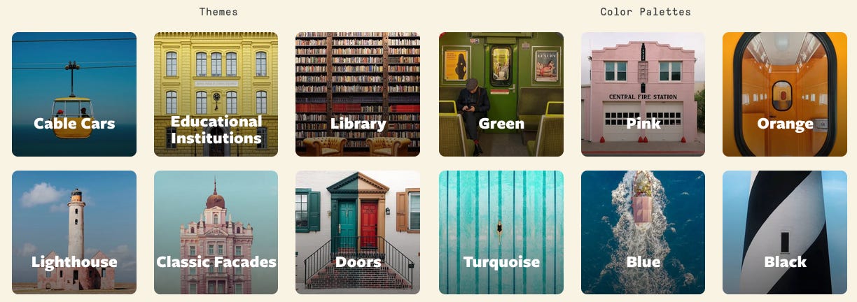 Wes Anderson is an American filmmaker known for distinct visual style—symmetry and centered framing, distinct color palettes and lateral tracking. This website is a collection of pictures from around the world that mimic that Anderson style. It’s a fun site.