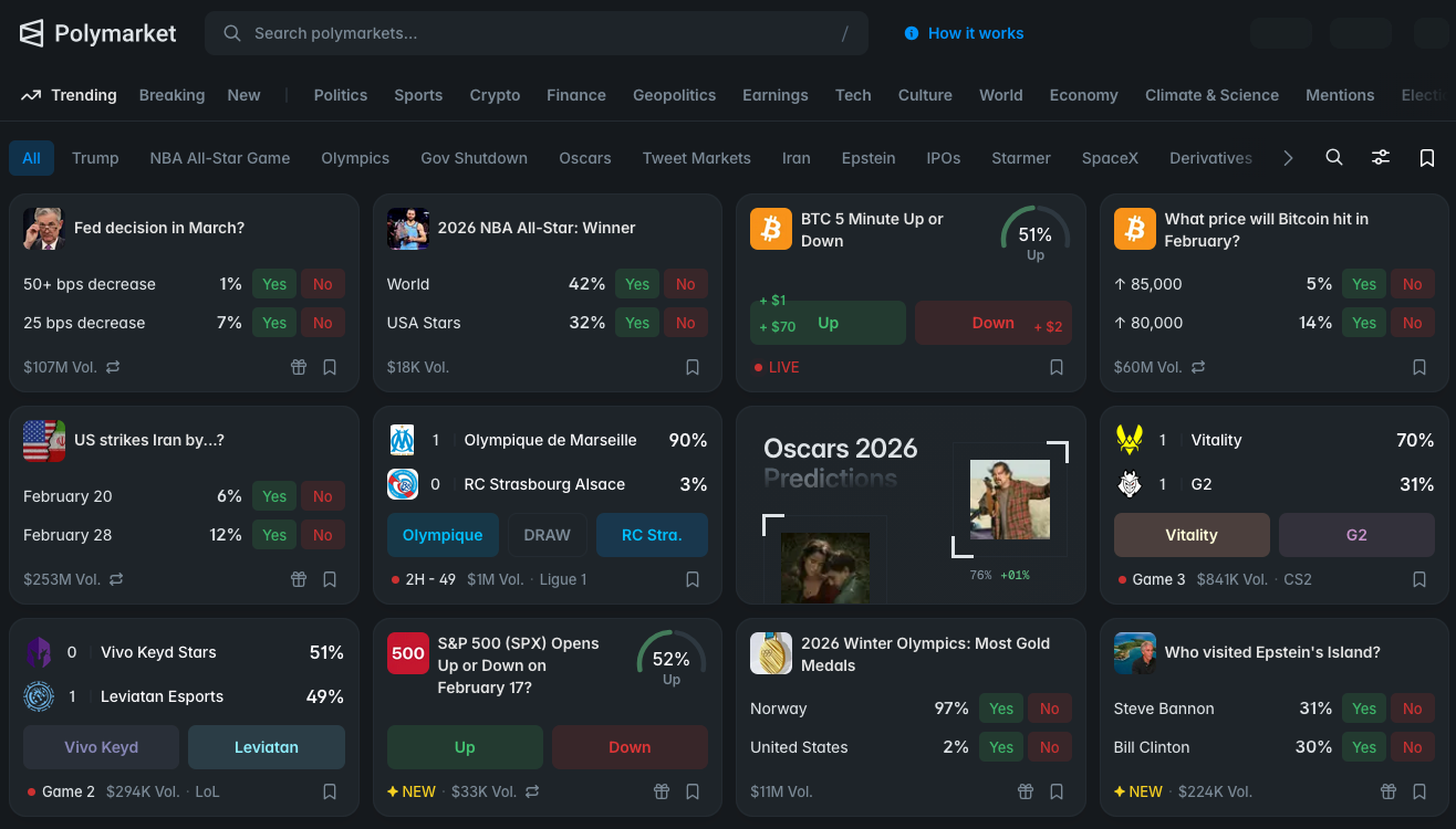 NOTE: You can bet (or start a betting market) on just about anything in Polymarket—from the fed interest rate decision, to sports, to Epstein Island. In the screenshot below there is currently around $200M worth of bets being made on Polymarket…and that’s only 12 markets. I’m guessing there are hundreds of markets.