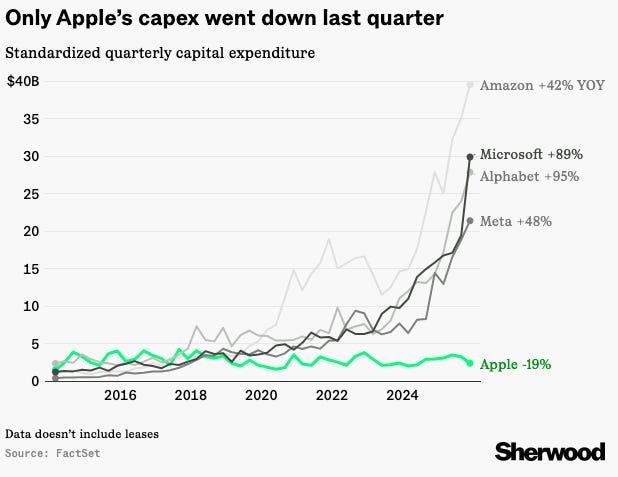 Apple stands apart, with capital spending declining year over year and remaining far below peers. Rather than building massive in-house AI infrastructure, Apple is pursuing a hybrid strategy that relies partly on third-party providers, including a reported $1 billion-per-year deal to use Google’s Gemini for Siri and Apple Intelligence. This approach limits capital risk and keeps spending off its balance sheet, but it also means Apple won’t fully control foundational AI technology if it proves transformative.