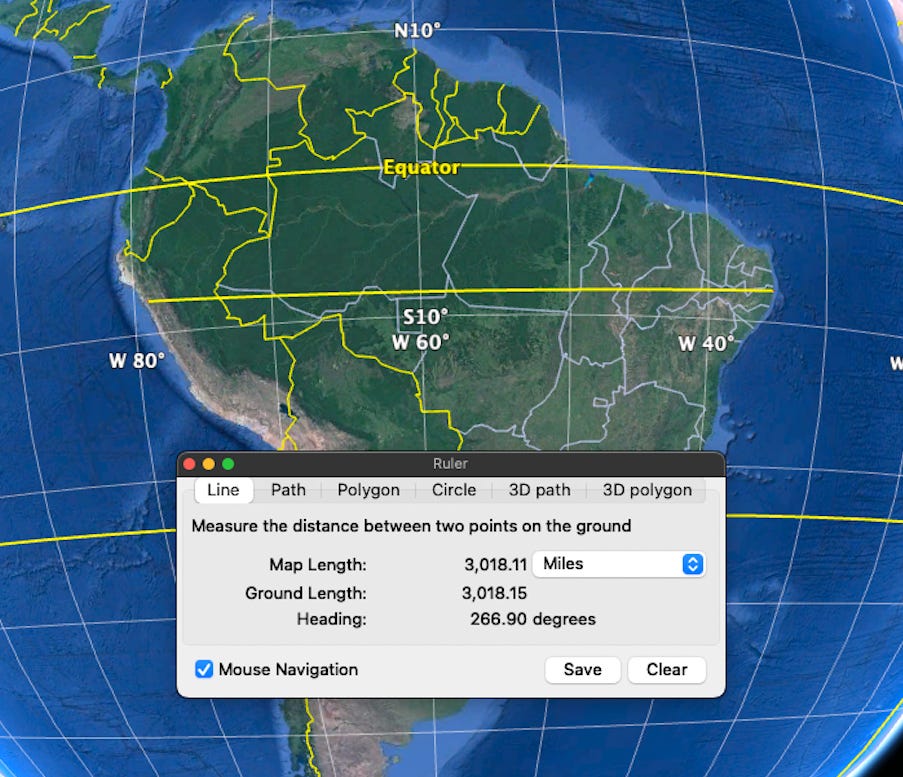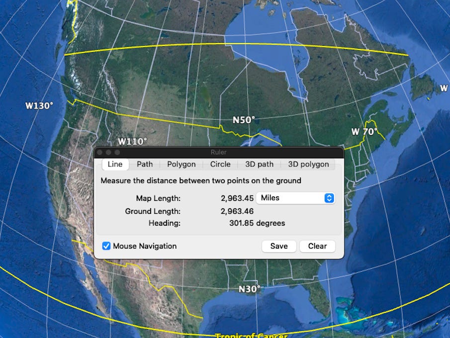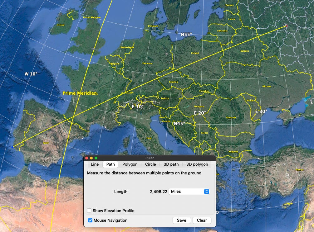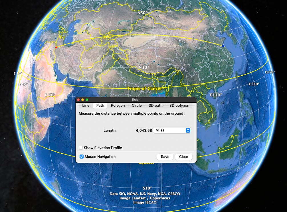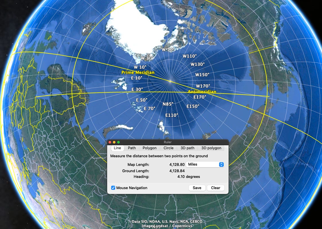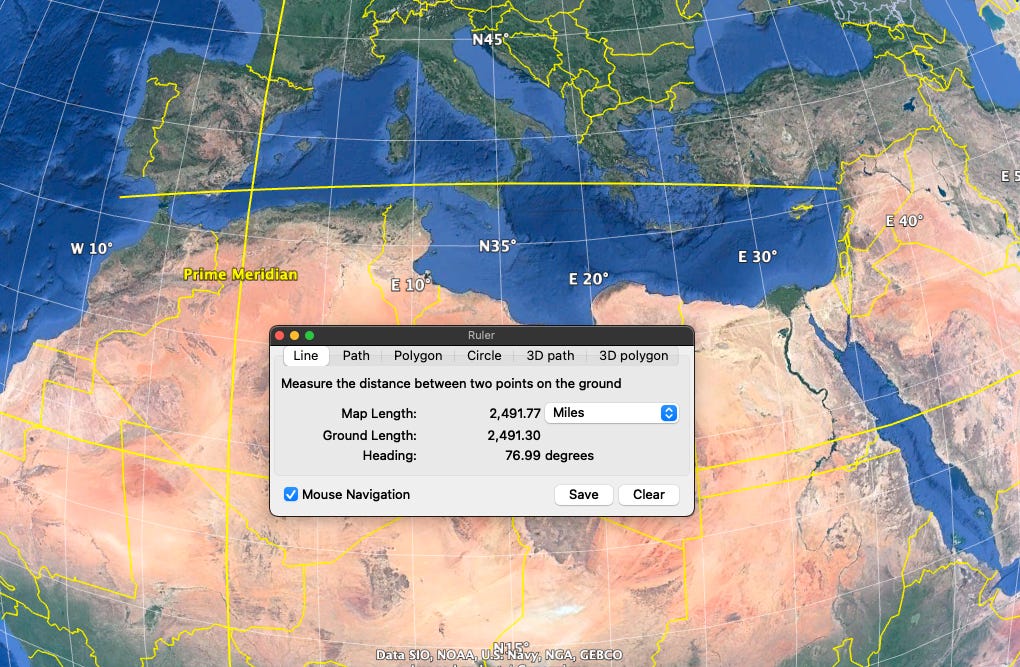 3. (This is where it gets a bit complicated) Because the earth is a sphere, the shortest distance between two points is not necessarily a straight line, but instead an arc called “a great circle.” You can read more here and here.