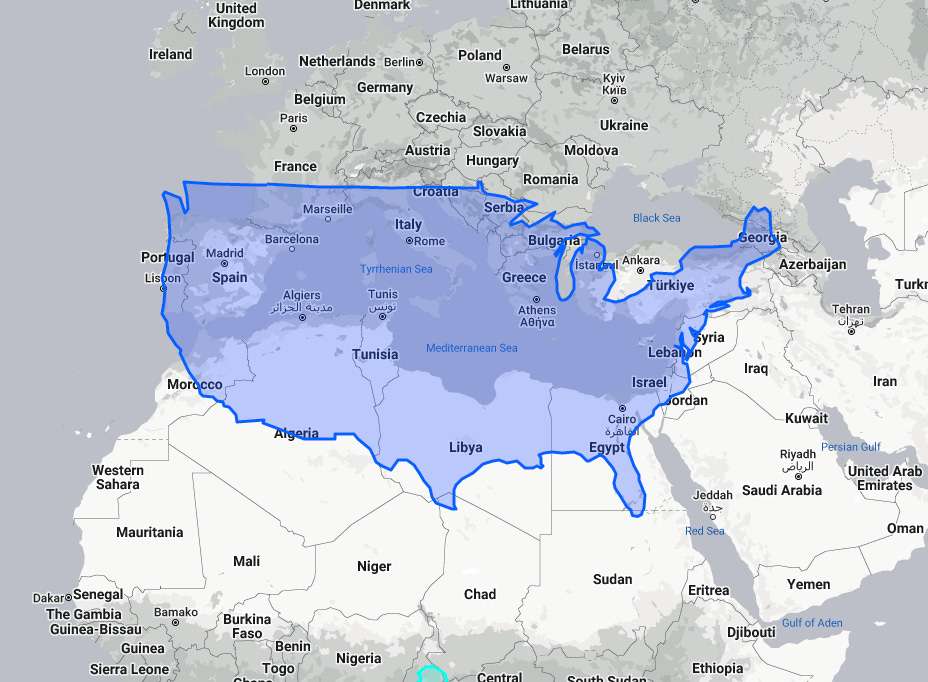 And roughly 2,500 miles across the Mediterranean (measured to the outer part of Portugal).