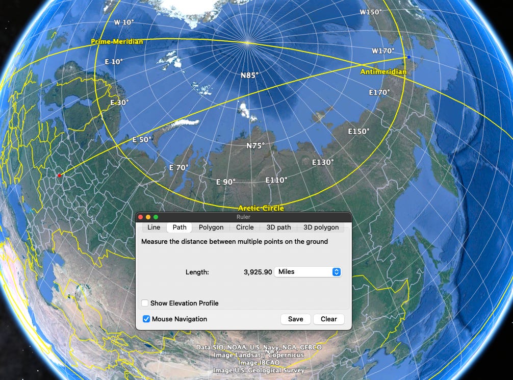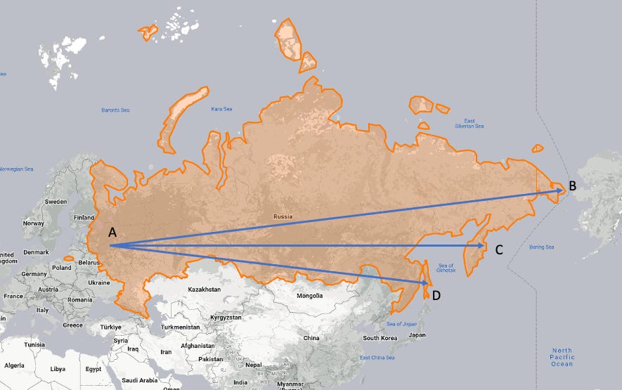 At first, you might think that the obvious and longer distance is from A to B, but, here’s the thing, the actual great circle distance to each of these locations from Moscow is roughly 4,000 miles (give or take about 100 miles). In essence, they’re all about the same distance.