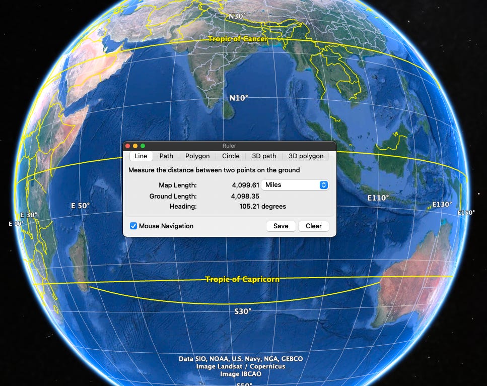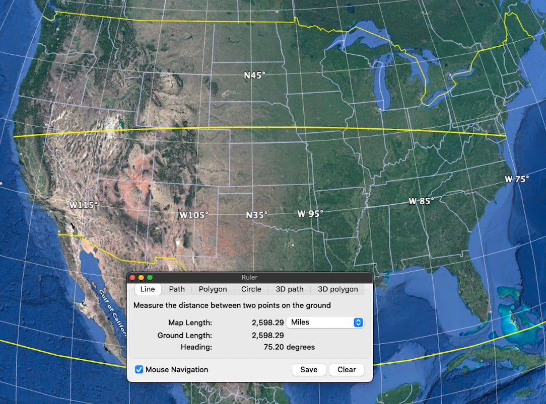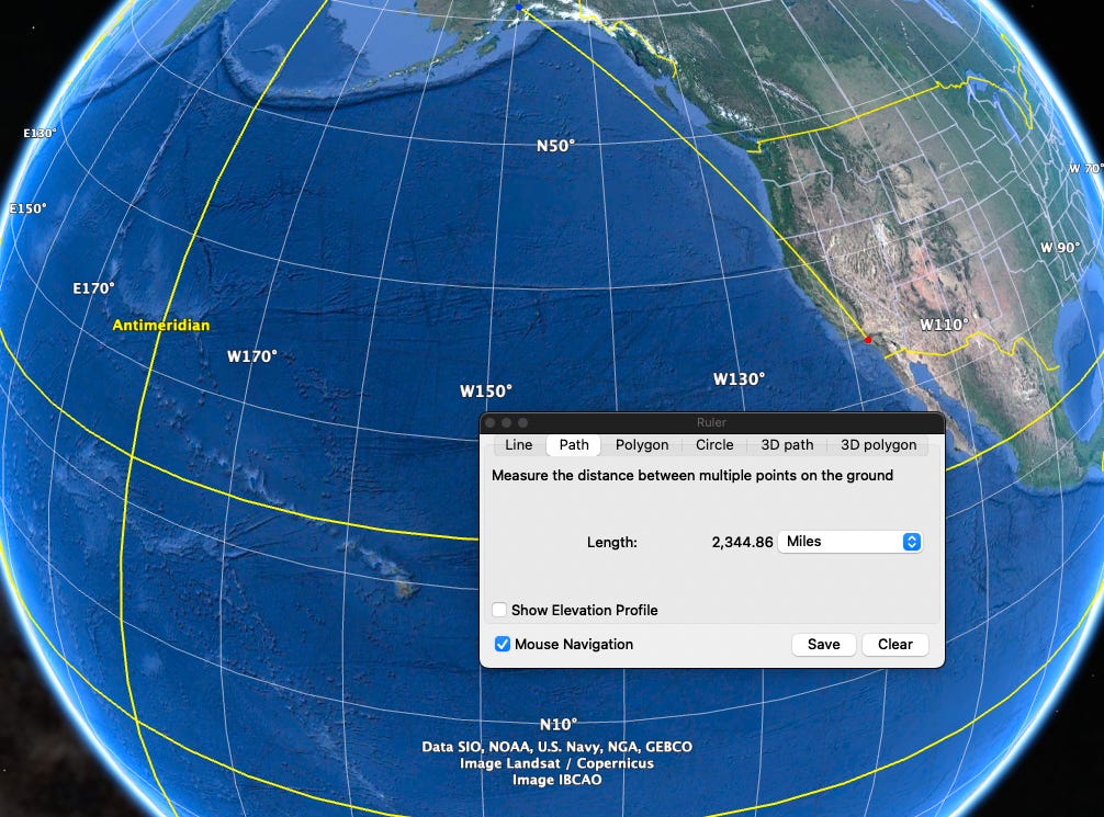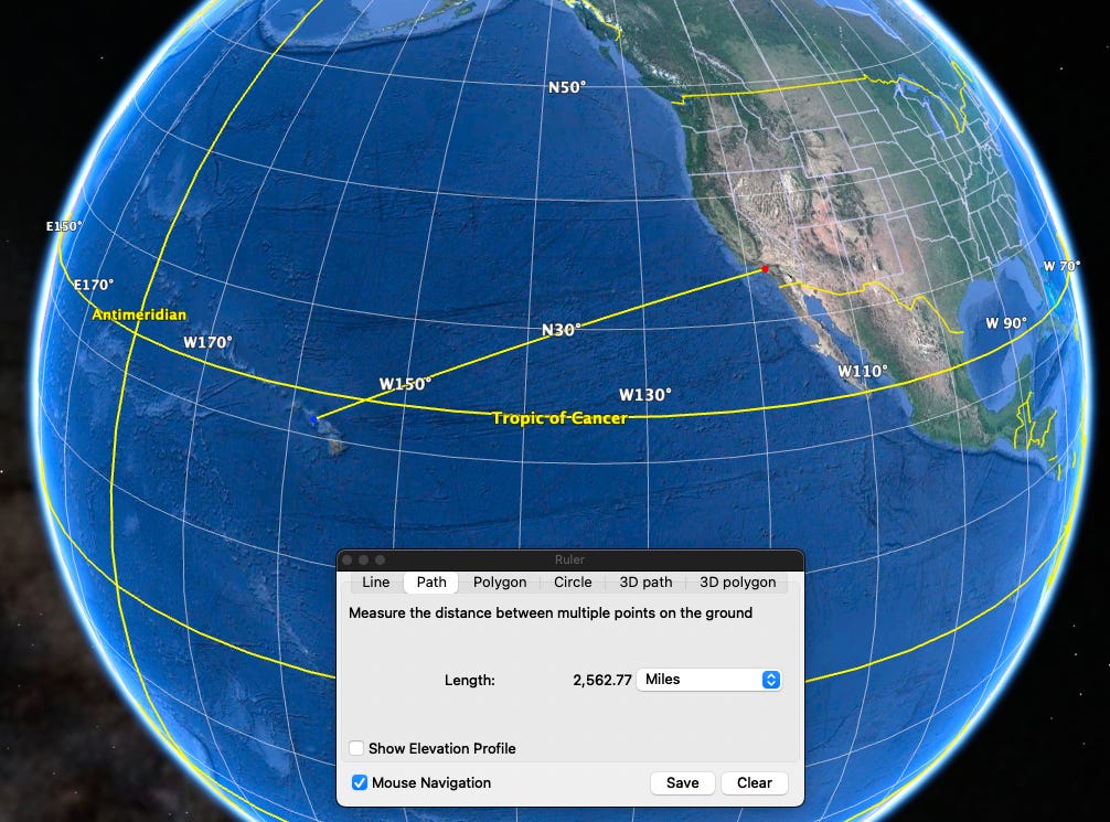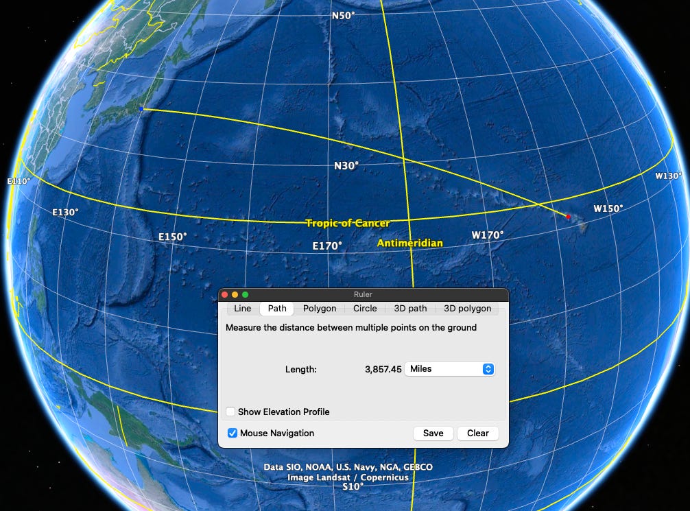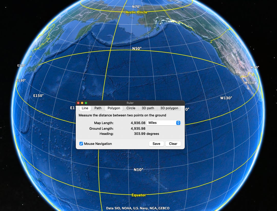 The yellow path that arches across the top is the shortest distance from the U.S. mainland to the Japan mainland; you’ll notice that it is not parallel to the latitudinal lines (the white lines that go left and right). If you were to measure the distance of a path that stays at the same latitude, then it would be longer. In the image above, the distance along the latitude would be about 300 miles longer—and this is why ships and planes use great circle routes instead. If you’re interested in learning how to calculate the distance of two points that sit at the same a latitude, you read about it here.