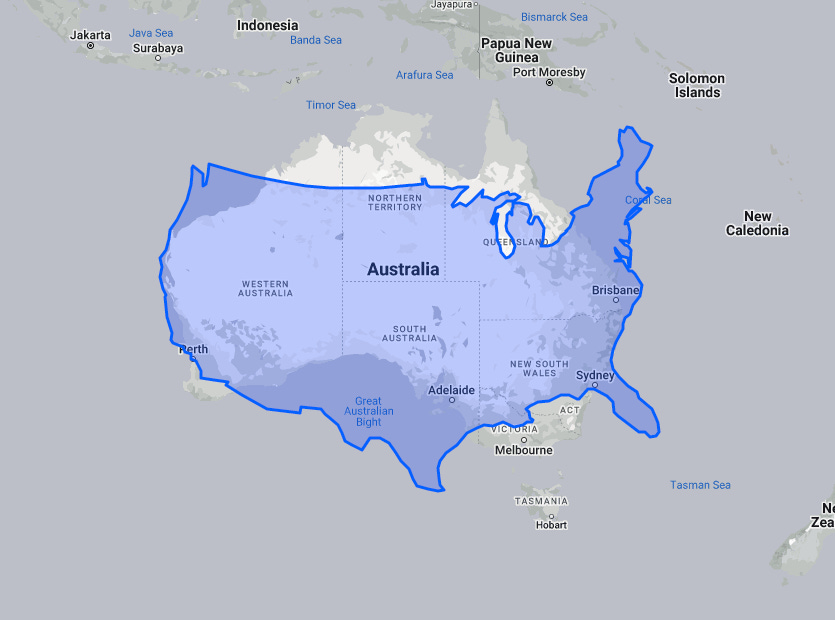 Moving down to Australia, we find that it is roughly 2,500 miles wide—similar to the US.