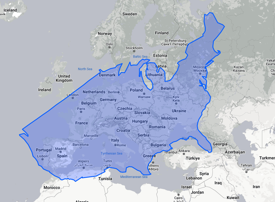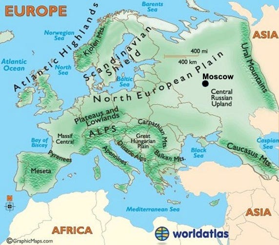 However, instead of measuring to the Ural Mountains, or to the eastern edge of Belarus or Ukraine, let’s just measure Europe from the west coast of Portugal to Moscow…which conveniently works out to about 2,500 miles (😊). For reference, Moscow is about 300 miles from the border of Belarus and Ukraine and about 800 miles from the Ural Mountains.