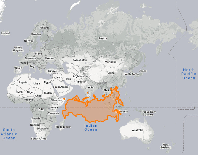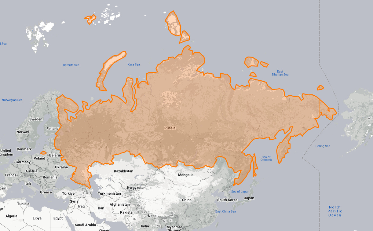 Here’s where things get a little wonky due to how far away we’re getting from the equator and how oddly shaped Russia appears. On a Mercator (flattened) map, this is what Russia looks like: