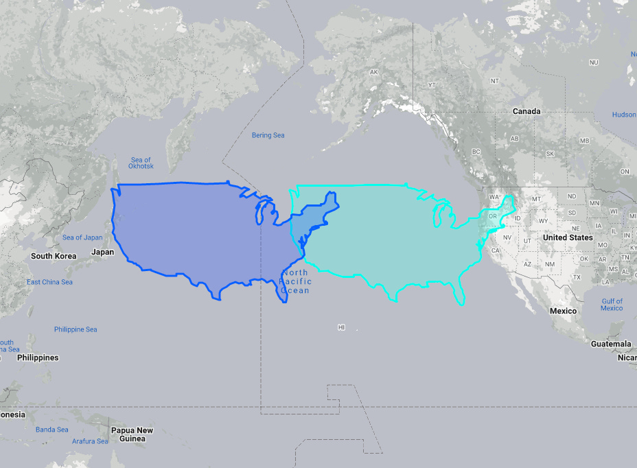Lastly, let’s jump north—note that the distance between the US and Japan is close to 5,000 miles, or twice the width of the United States.