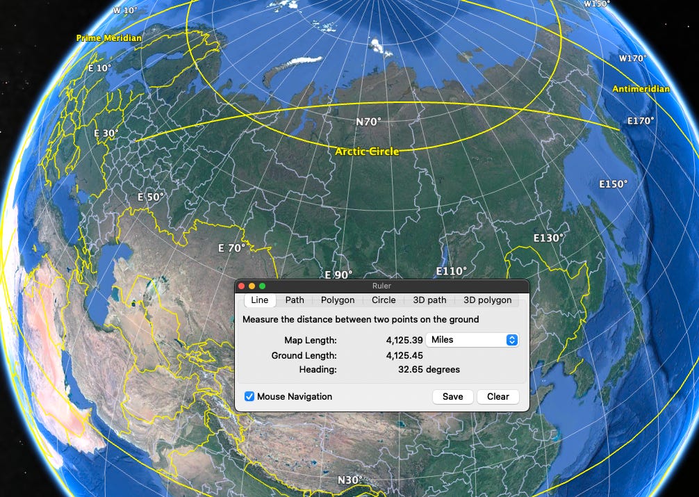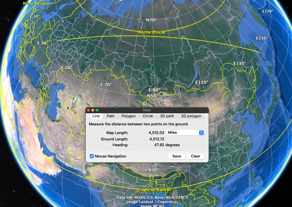 Lastly, you may be wondering about the latitudinal length of Russia. Well, that’s little hard to say because the borders are uneven. But, if we take Big Diomede island at a latitude of 65°24’ N and a longitude of 169° W, and then find the longitude of the westernmost part of mainland Russia at that same latitude, which is 29°45’ E, then do the fancy math described in the link way above, it equals about 4,700 miles.