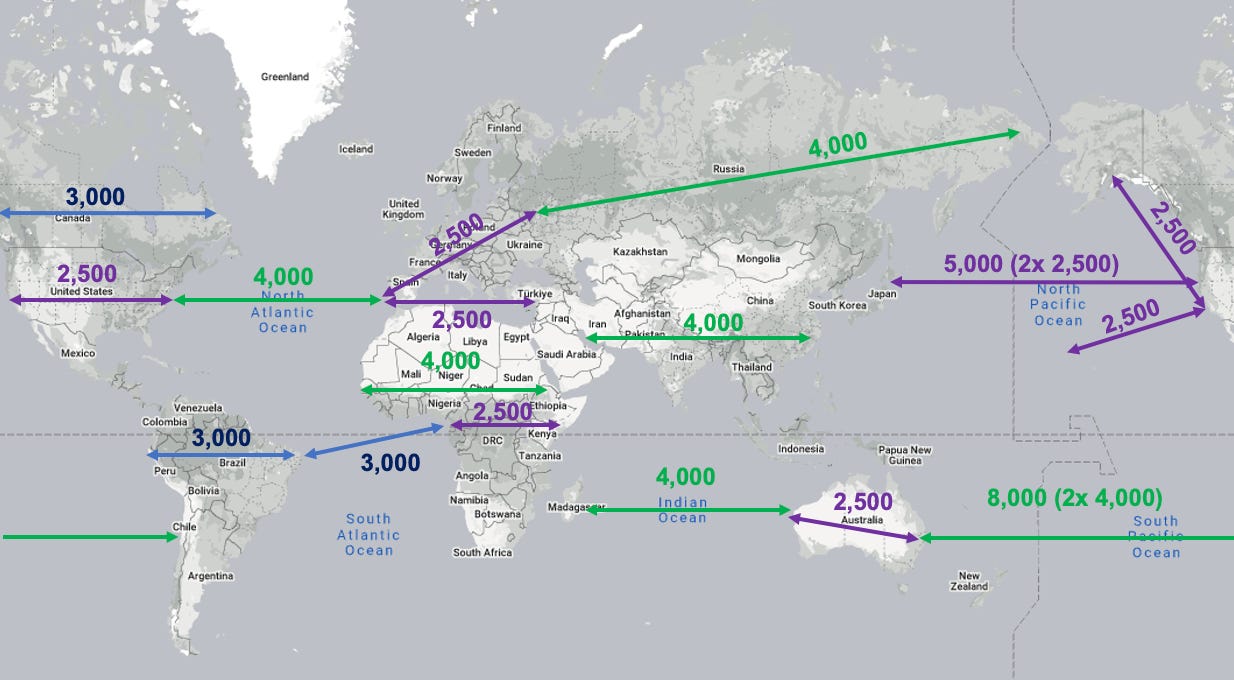 I’m sure some people will argue that I’ve cherry-picked certain to-from locations in order to get distances that conveniently align with the numbers 2,500, 3,000, and 4,000. And while I did take some liberties on where I picked to-from locations, I would also argue that there are innumerable spots that could’ve been chosen for each country or continent, and I think you’ll find the locations I chose do make sense. Regardless, the idea is to provide you heuristic, and not exact distances.