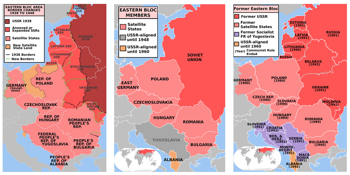 In Europe-Part 1, I showed the following pictures of how most of these countries were part of the former Soviet Union during the 20th century. You can see the progression of borders and political alliances below.