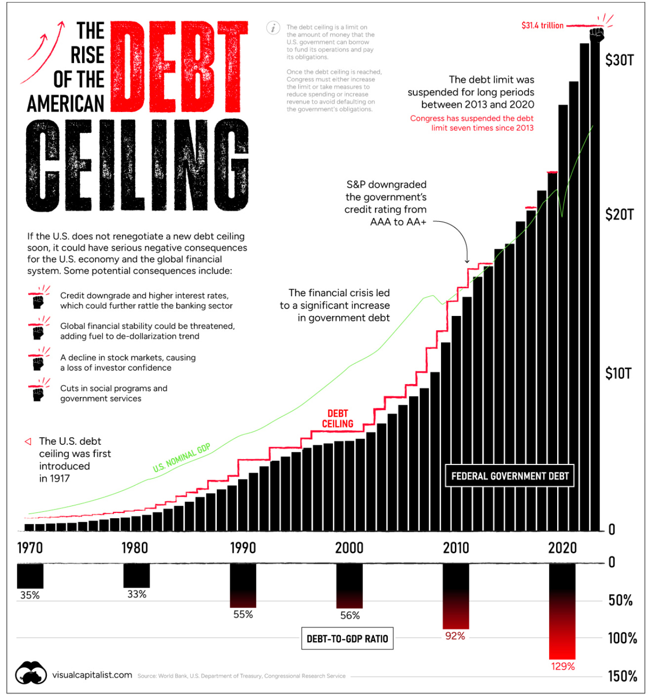 As the Visual Capitalist article this image is from describes, there are three potential consequences of the US not being able to pay its debt: higher interest rates, erosion of our international credibility, and financial sector turmoil. Let’s explore each.