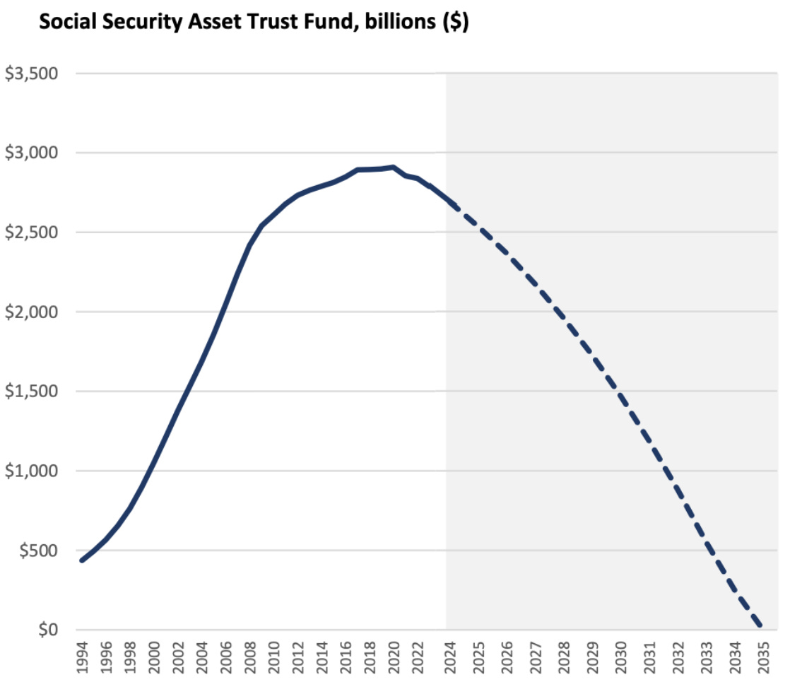 And here’s the problem, according to the 2024 annual Old-Age, Survivors, and Disability Insurance (OASDI) trustees report by the Social Security Administration (SSA), the projected depletion date for the combined OASDI trust funds is 2035, a year earlier than in last year’s report. Yes, folks, absent any changes, our nation’s Social Security fund will be gone in 10 years: