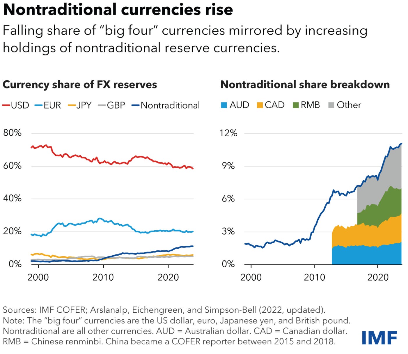 In the 19th century and first half of the 20th century, the United Kingdom’s pound sterling was used as the primary reserve currency, but by the middle of the 20th century the US dollar rose to dominancy. In 1970, the US dollar represented nearly 85% of global currency reserves, now it represents less than 60%.