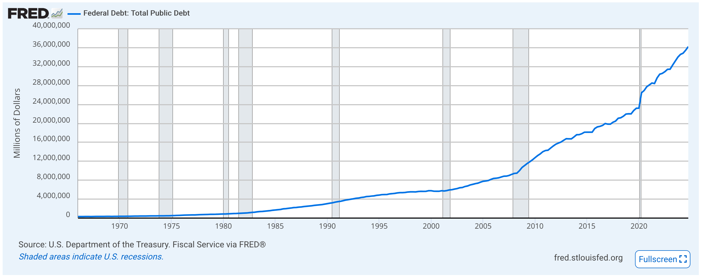 All of that deficit (overspending) adds up each year and contributes to our nation’s overall debt, which currently stands at over $36 Trillion dollars.