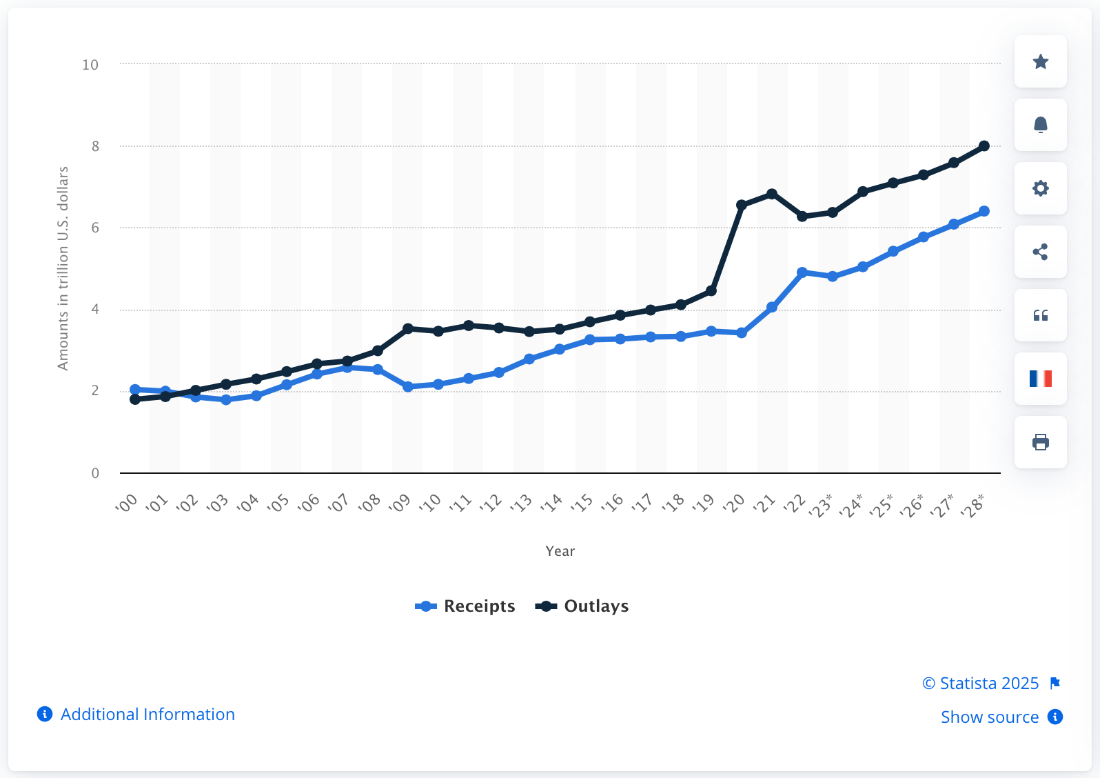 Another way to visually understand this data is using the chart below, which show the difference between the receipts and outlays for each year (the yearly spread between the two lines in the above graph).