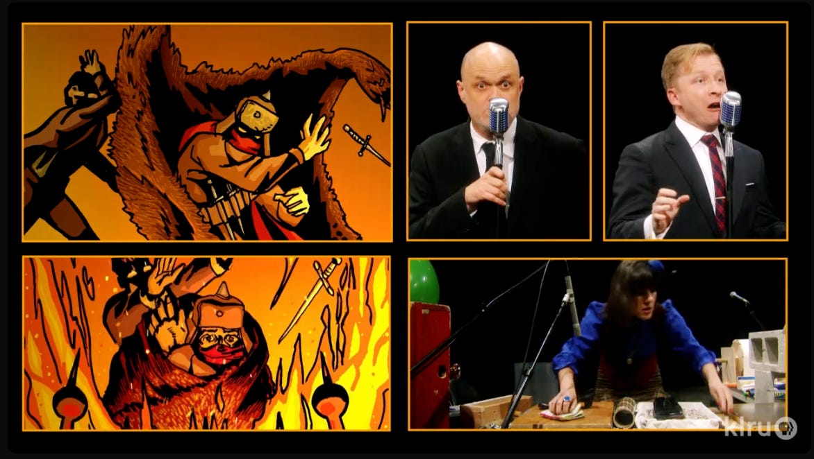 Originally performed and recorded as a radio drama in 1996 in an Austin coffeehouse, the show eventually grew to broadcast quality, and they ended up going on the road as a live stage play. They were even on Conan O’Brien’s show and NPR’s All Things Considered. Kansas State even put together a study guide for the show, providing background on the creator and the genre. We saw the show in 2014—almost 20 years later—as they toured the country. We loved the show.