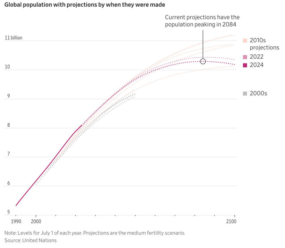 The world’s population is projected to peak at around 10.29 billion people in 2084 before declining to 10.18 billion by 2100, according to the United Nations (WSJ 🔒)📊.