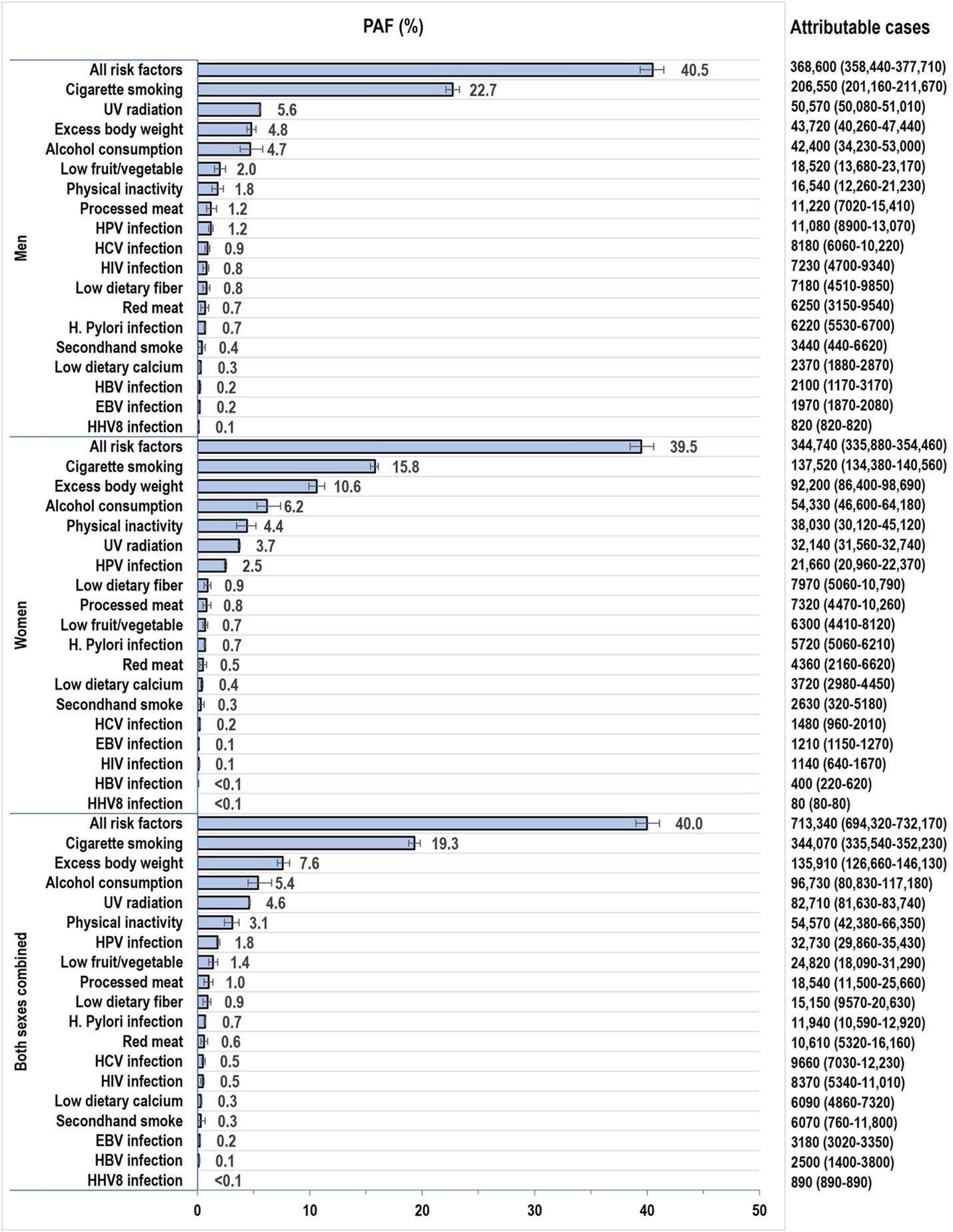 About 40% of new cancer cases among adults ages 30 and older in the United States — and nearly half of deaths — could be attributed to preventable risk factors, according to a new study from the American Cancer Society. verall, researchers analyzed 18 modifiable risk factors across 30 types of cancer. In 2019, these lifestyle factors were linked to more than 700,000 new cancer cases and more than 262,000 deaths, the study found. Cancer grows because of DNA damage or because it has a fuel source, Kamal said. Other things — such as genetics or environmental factors — can also create these biological conditions, but modifiable risks explain a significantly larger share of cancer cases and deaths than any other known factors. Exposure to sunlight can damage DNA and lead to skin cancer, for example, while fat cells produce hormones that can feed certain cancers. Potentially modifiable risk factors include: cigarette smoking; second-hand smoke; excess body weight; alcohol consumption; consumption of red and processed meat; low consumption of fruits and vegetables, dietary fiber, and dietary calcium; physical inactivity; ultraviolet radiation; and seven carcinogenic infections.