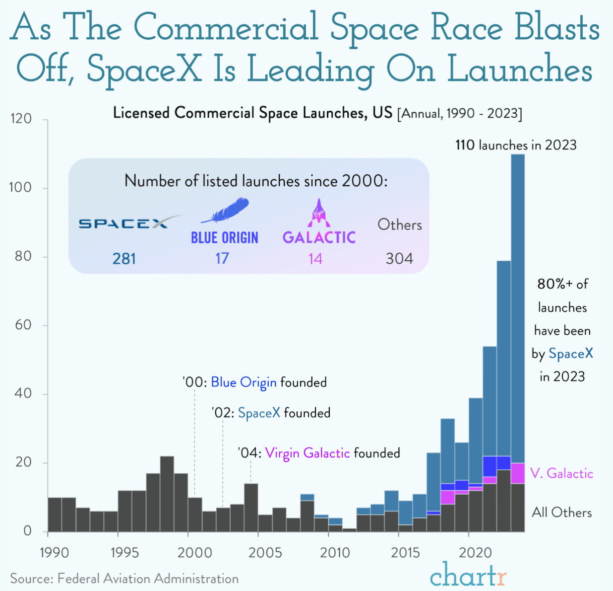 As the Commercial Space Race Blasts Off, SpaceX is Leading on Launches (Chartr)📊