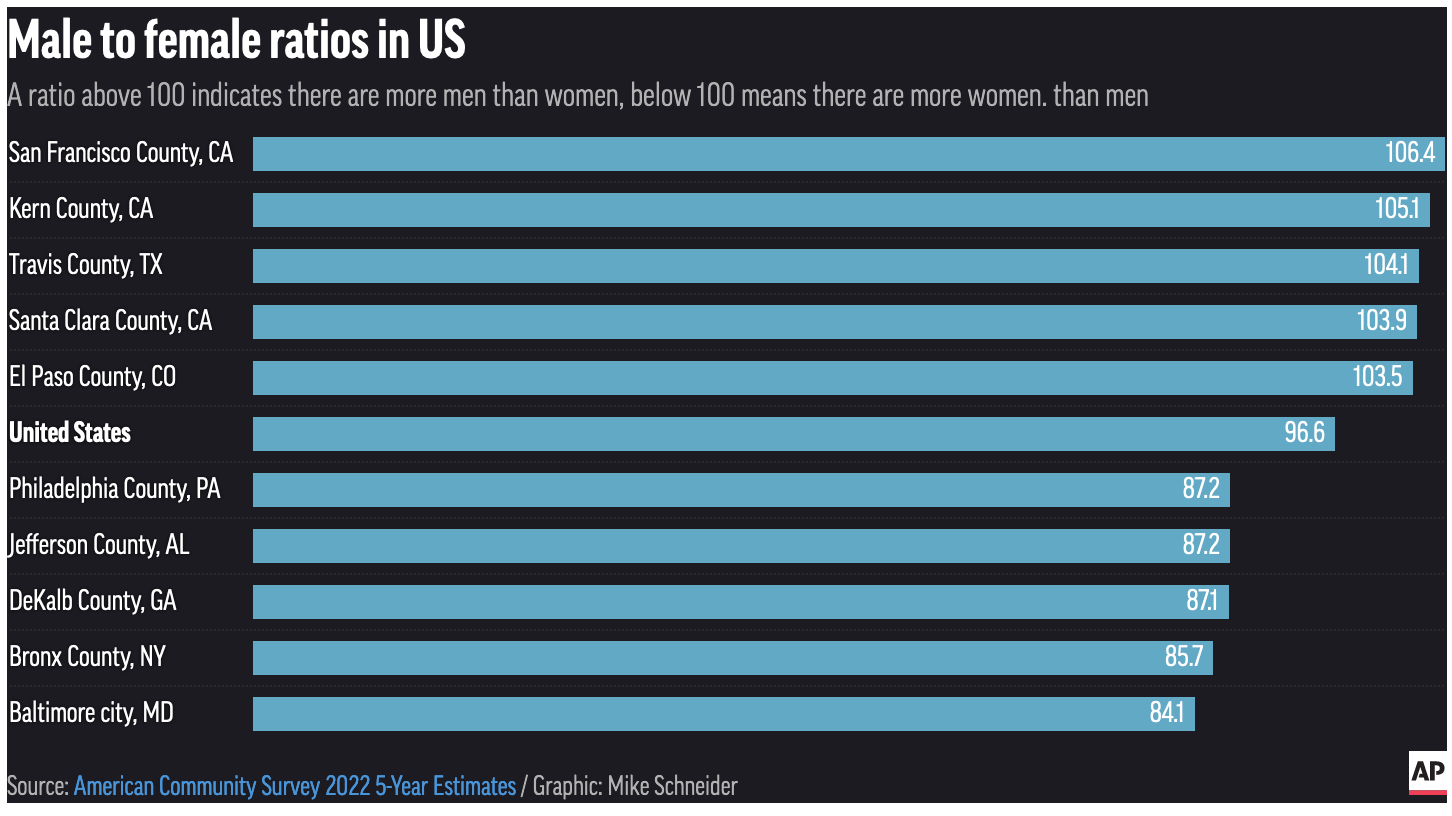 Why more women live in major East Coast counties while men outnumber them in the West (AP)📊