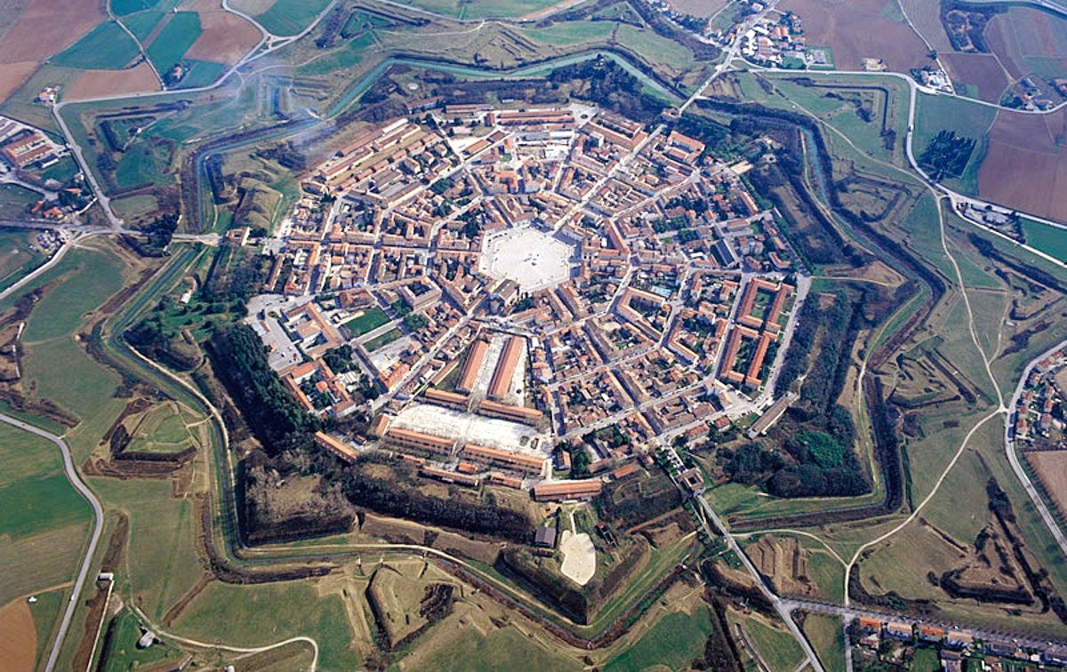 Palmanova was built following the ideals of a utopia. It is a concentric city with the form of a star, with three nine-sided ring roads intersecting in the main military radiating streets. It was built at the end of the 16th century by the Venetian Republic which was, at the time, a major center of trade. It is actually considered to be a fort, or citadel, because the military architect Giulio Savorgnan designed it to be a Venetian military station on the eastern frontier as protection from the Ottoman Empire.