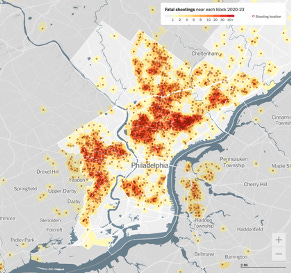 Yikes, Philly…so much for brotherly love! “There were at least 1,757 fatal shootings in Philadelphia from 2020-23. This map shows how many shootings were within a quarter mile of each block. About 75 percent of people lived near a shooting.”