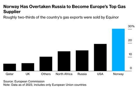 Europe's energy supply faces critical dependency as Norway's Equinor emerges as a key player, now supplying 30% of the bloc’s gas and replacing Russia’s Gazprom in prominence (Bloomberg🔒) 📊.
