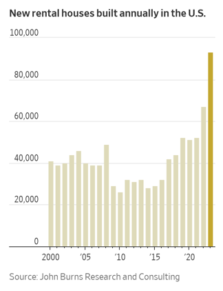 Developers are building new houses for rent at an unprecedented rate, aiming to capitalize on the steep home prices and higher mortgage rates that are forcing many Americans to keep renting. In 2023, 93,000 new single-family homes for rent were completed, according to estimates from housing consulting firm John Burns Research and Consulting. That was 39% more rental homes than in 2022, and the most in any year ever. The breakneck pace is poised to continue this year before easing by 2025.