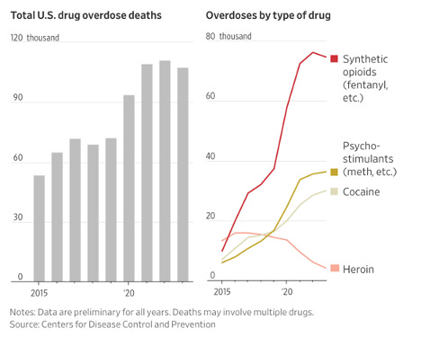 The U.S. saw a slight decline in the number of new overdose deaths last year, marking a rare improvement in a still-raging national fentanyl crisis, preliminary federal data show. There were about 107,500 overdose deaths in 2023, down 3% from the year before and the first decline in five years, according to estimates from the Centers for Disease Control and Prevention. One factor was fewer deaths pegged to opioids including the nation’s deadliest drug, the potent synthetic fentanyl, the CDC’s preliminary numbers show.
