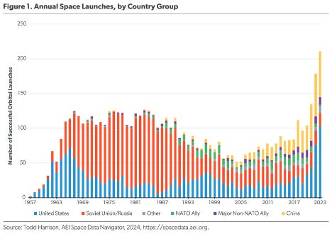 Space exploration is heating up again, with nations and private entities eyeing the moon for future missions. The reasons behind why everyone is heading back to the moon highlight the strategic importance of lunar exploration (Bloomberg🔒) 📊. Meanwhile, U.S. officials reveal that Russia launched a research spacecraft for an antisatellite nuclear weapon two years ago, raising concerns over space militarization (WSJ🔒). To maintain its lead, the U.S. aims to build an enduring advantage in the third space age through sustained innovation and strategic planning (AEI) 📊.