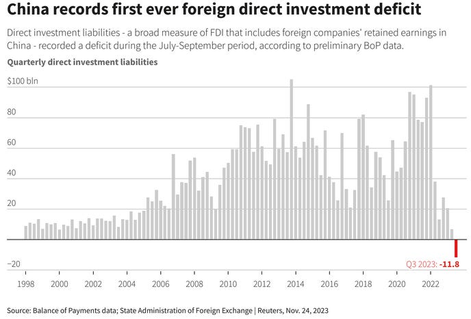 Foreign investors have been sour on China for most of this year, but data released over the past month has provided clear evidence of the negative impact de-risking strategies are having on the world's second-largest economy. Activity surveys showed manufacturing unexpectedly contracted in October, while exports accelerated their decline. China recorded its first-ever quarterly deficit in foreign direct investment in July-September, suggesting capital outflow pressure.