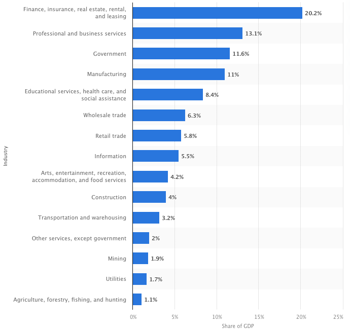 Share of value added to the gross domestic product of the United States in 2022, by industry (Statista)