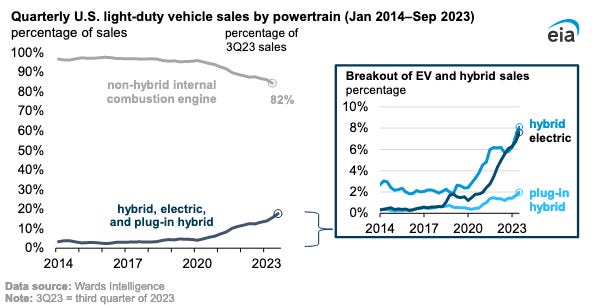 Electric vehicles and hybrids grow to a record-high 18% of U.S. light-duty vehicle sales (U.S. Energy Information Administration) 📊