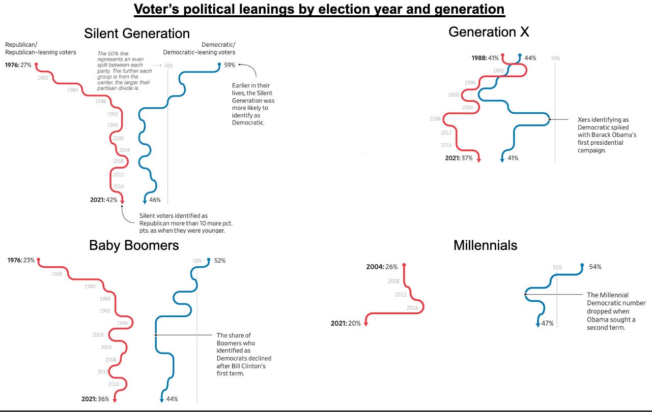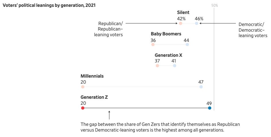 One of the most durable forces shaping the U.S. electorate is that voters tend to lean more Republican as they age. But it also matters where they begin on the political spectrum, and there are indications that millennials and the oldest members of Generation Z started out more liberal than prior generations. That has made them a crucial base of support for Democrats, even as some other groups of voters have moved away from the party.