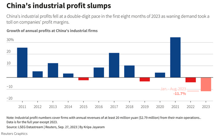 China's industrial profits extend slump for January-August, pace of downturn eases (Reuters) 📊