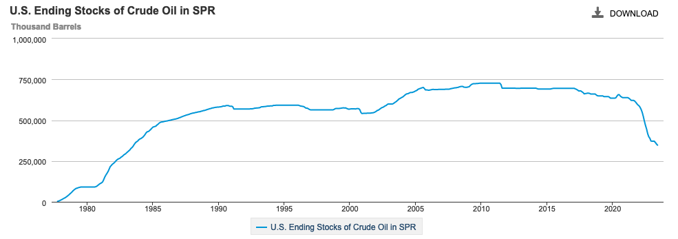 I’m not seeing much in the news about this—but at the end of Jun 2023, our US Strategic Petroleum Reserves sat at 347M barrels; the last time it was this low was in 1983. This decrease is due to the US government trying to keep prices down in the US due to supply limits by OPEC and increased prices elsewhere.